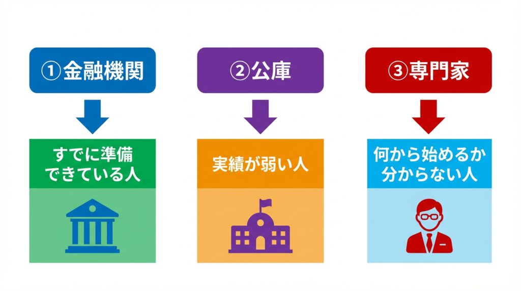 結論として、相談先を間違えると、資金調達の可能性は下がります。なぜなら、相談先によって“できること”が全く違うからです。